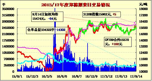9月14日隔夜鄭棉CF1801合約區(qū)間震蕩,今日早盤延續(xù)盤整走勢(shì),午后在集中平倉(cāng)盤的打壓下放量收低,日線形成陰線。日內(nèi)成交量萎縮,持倉(cāng)量減少?;久媲闆r:江蘇蘇北傳統(tǒng)棉區(qū)雖難見大片棉田,但散種棉花移栽較早的棉花基部已見少數(shù)棉鈴?fù)滦?。?jù)大豐、射陽(yáng)等地農(nóng)技人員反映,新近吐絮或采拾的棉花通常是早期伏桃,但量不多。近期,當(dāng)?shù)靥鞖獠槐M正常,加上陰雨影響,一些棉田里出現(xiàn)了爛黃桃,農(nóng)戶及時(shí)采收剝出絮棉。還有就是棉株底層基部僵果以及農(nóng)田作業(yè)所致落地鈴、蟲傷鈴等剝出的混級(jí)棉。這些棉花數(shù)量少,品質(zhì)較差,若不嚴(yán)格分揀,交售時(shí)難上4級(jí)。