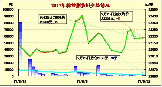 9月25日隔夜鄭棉CF1801合約盤跌,今日盤中一度反抽,但是隨后在平倉盤打壓下收低,日線形成陰線星。日內(nèi)成交量放大,持倉量減少?;久媲闆r:現(xiàn)貨市場(chǎng)穩(wěn)定,商家清庫等待新棉為主,河南庫疆棉手摘3128、2128級(jí)銷售報(bào)價(jià)在16500元/噸左右公定自提。一商家張家港庫4227、4327儲(chǔ)備山東地產(chǎn)棉報(bào)價(jià)14500元/噸過磅毛重,整體成交不多,多觀望。新疆籽棉收購(gòu)價(jià)格相對(duì)堅(jiān)挺,南疆阿克蘇等地價(jià)格在7元/公斤,奎屯主流在7.5元/公斤,機(jī)采棉收購(gòu)價(jià)也漲至6.6元/公斤。