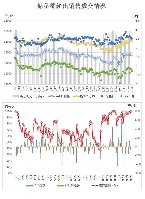 9月28日儲(chǔ)備棉輪出銷售資源30478.3189噸,實(shí)際成交30478.3189噸,成交率100.00%。成交平均價(jià)格14740元/噸(較前一日價(jià)格跌70元/噸);折3128價(jià)格16071元/噸(較前一日價(jià)格跌30元/噸)。