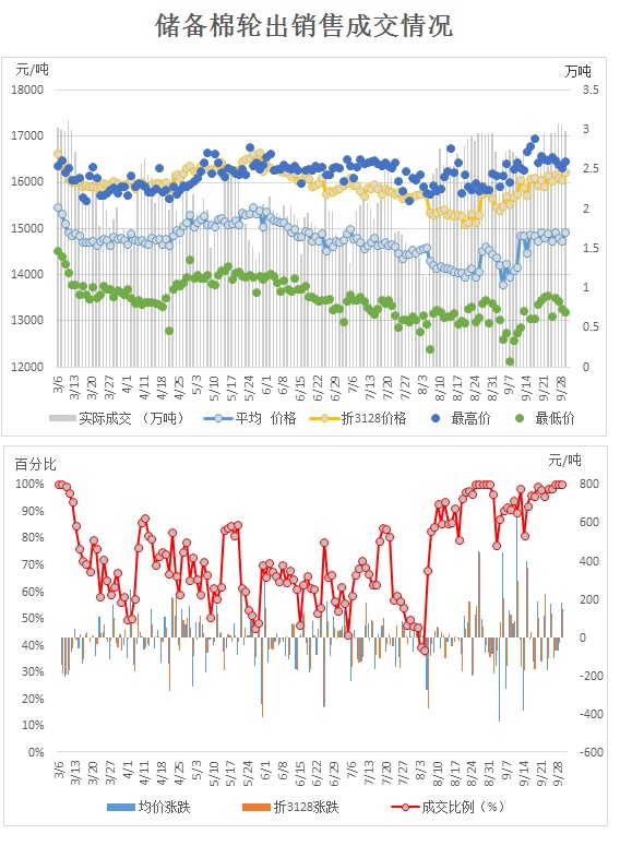 9月29日儲備棉輪出銷售資源29790.8252噸,實際成交29790.8252噸,成交率100.00%。成交平均價格14923元/噸(較前一日價格跌70元/噸);折3128價格16219元/噸(較前一日價格跌30元/噸)。