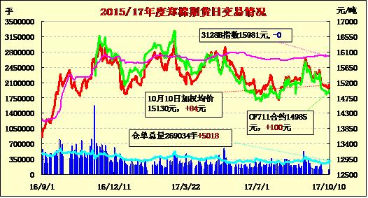 10日隔夜鄭棉CF1801合約盤整,今日早盤在多頭買盤推動下上沖,隨后橫向震蕩,午后在空頭賣盤與平倉盤壓制下回落,日線形長上影線的陽線星。日內(nèi)成交量萎縮,持倉量增加?;久媲闆r:十一期間,棉花市場基本維持,受棉籽價(jià)格下跌影響,籽棉收購價(jià)格略有走弱,機(jī)采棉收購價(jià)格在6.1-6.3元/公斤,軋花廠對收購質(zhì)量嚴(yán)格控制。市場新棉逐步上市銷售,山東、河北庫南疆手摘棉2129、2130級報(bào)價(jià)在17000-17400元/噸毛重。雖儲備棉輪出節(jié)前結(jié)束,但商家儲備棉庫存仍在轉(zhuǎn)售,3128級地產(chǎn)價(jià)格在14000-14500元/噸左右,3129級疆棉價(jià)格在15300元/噸左右。