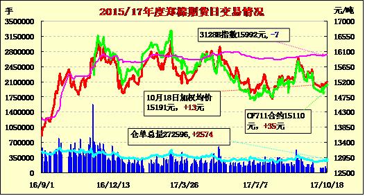 18日隔夜鄭棉CF1801合約下滑,今日早盤在空頭回補(bǔ)推動(dòng)下回升,此后區(qū)間震蕩,午后小幅下滑,日線形成陽線星。日內(nèi)成交量萎縮,持倉量減少?;久媲闆r:新棉逐步上市,市場報(bào)價(jià)增多,新疆2129級(jí)報(bào)價(jià)在16500-16700元/噸毛重出廠,零星有小單商談成交,下游紡企多觀望為主。而國儲(chǔ)棉商談仍占據(jù)主導(dǎo),地產(chǎn)主流價(jià)格在14300-14500元/噸。整體下游紡企前期拍儲(chǔ)后多已備好近3個(gè)月庫存量,近期對(duì)棉花需求不多,多零星采購為主。因十九大因素,新疆貨運(yùn)限制嚴(yán)重,據(jù)悉,軋花廠表示現(xiàn)汽運(yùn)難尋,新疆牌照現(xiàn)在一律不能出疆。