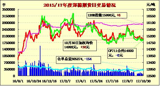 | CF805 | 14930 | 15040 | 14900 | 14955 | 14965 | 25 | 15060 | 2194 | 220768 | 79446 | -294 |