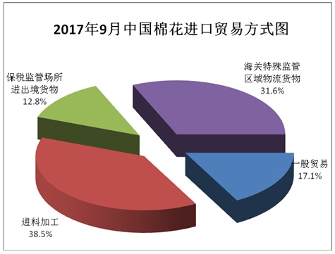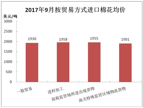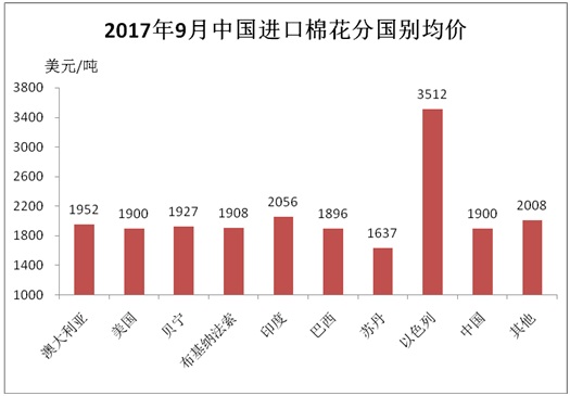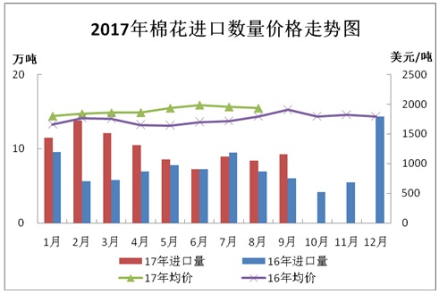 據(jù)海關(guān)統(tǒng)計(jì),2017年9月我國(guó)進(jìn)口棉花9.27萬(wàn)噸,環(huán)比增長(zhǎng)10.5%,同比53.6%;平均進(jìn)口價(jià)格1935美元/噸,較8月上漲3美元,漲幅0.1%,同比上漲1.4%。2017年1-9月我國(guó)累計(jì)進(jìn)口棉花90.4萬(wàn)噸,同比增長(zhǎng)37.7%。