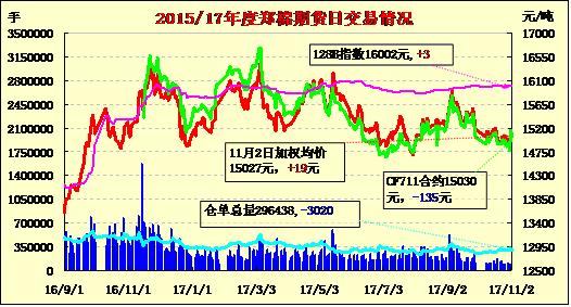 2日隔夜鄭棉CF1801合約盤升,今日早盤下試回升,午后一度調(diào)整,尾盤在空頭回補推動下放量走高,日線形成陽線。日內(nèi)成交量放大,持倉量減少。基本面情況:棉花現(xiàn)貨市場波瀾不驚,軋花廠多邊加工邊銷售,且收購謹(jǐn)慎,籽棉收購價格微跌,皮棉價格基本維持,機采棉價格在15900-16200元/噸毛重自提。河北等地棉企多未放量收購,皮棉走貨緩慢,目前多以12、22級為主,價格在15500元/噸左右,少數(shù)好質(zhì)量資源如嚴(yán)挑三絲的走貨尚可,因疆棉即將大量達(dá)到內(nèi)地,將對地產(chǎn)棉市場造成極大壓力。
