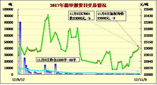 8日隔夜鄭棉CF1801合約沖高回落,今日盤中低位震蕩,午后小幅反彈,日線形成小陰線。日內(nèi)成交量萎縮,持倉量減少。棉花現(xiàn)貨市場相對穩(wěn)定,軋花廠多邊加工邊銷售,且收購謹慎,籽棉收購價格微跌,皮棉價格基本維持,機采棉價格在15600-16200元/噸不等,商談不多。地產(chǎn)方面,目前安徽等地籽棉收購價格在3.25-3.35元/公斤衣分38%,4級皮棉報價在15000元/噸,弱4級在14600元/噸,銷售壓力較大,小廠停收較多。部分紡紗企業(yè)反映目前棉花庫存都備至12月底,不急于采購,視價格及棉花質(zhì)量合適零星補貨。