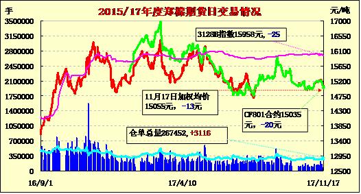 17日隔夜鄭棉CF1801合約震蕩下滑,今日盤中延續(xù)盤跌走勢,尾盤減倉反彈,日線形成小陰線。日內(nèi)成交量放大,持倉量增加?;久媲闆r:進入11月新疆棉發(fā)運逐漸步入高峰期。據(jù)北疆的部分企業(yè)反映,由于運輸繁忙,北疆鐵路車皮非常緊張,可謂一車難求。公路運輸車雖相對好找,但價格也上漲較快。目前北疆奎屯棉花運到山東大約820元/噸,相比一個月前上漲約100元/噸。南疆鐵路運力也偏緊,公路運輸從庫爾勒運到河南運費大約770元/噸,相比一個月前上漲約120元/噸。放眼內(nèi)地,籽棉采摘進入尾聲,交售工作有序進行,但皮棉銷售滯緩,紡企購買意向偏弱,銷售壓力加大。