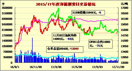 20日隔夜鄭棉CF1801合約下試回升,今盤中回落后盤整,日線形成陰線。日內成交量放大,持倉量增加。基本面情況:棉花現(xiàn)貨弱勢調整,新疆棉雙28級強力27以上內地庫價16500-16600元/噸毛重,機采棉新疆庫價15600-15800元/噸,實際商談優(yōu)惠,商家出庫存為主。內地籽棉采摘進入尾聲,籽棉交售量50%左右,河北等地收購價報3.3元/斤左右。皮棉銷售滯緩,4128級報價14700-14900元/噸左右。因儲備棉資源逐步減少,新棉成交略增,但紡企整體采購意向清淡。