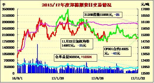 22日隔夜鄭棉下試回升,今日早盤增量沖高,隨后高位震蕩,午后增倉(cāng)下滑,CF1801合約日線形成陰線,1805合約報(bào)收陽(yáng)線星。日內(nèi)成交量放大,持倉(cāng)量近減遠(yuǎn)增?;久媲闆r:棉花現(xiàn)貨市場(chǎng)弱勢(shì)調(diào)整,疆棉雙28級(jí)強(qiáng)力27以上內(nèi)地庫(kù)價(jià)格在16500-16600元/噸毛重,機(jī)采棉新疆庫(kù)價(jià)格在15600-15800元/噸,實(shí)際商談優(yōu)惠,商家出庫(kù)存為主。內(nèi)地籽棉采摘進(jìn)入尾聲,籽棉交售量在50%左右,河北等地收購(gòu)價(jià)格報(bào)3.3元/斤左右。皮棉銷售滯緩,4128級(jí)報(bào)價(jià)在14700-14900元/噸左右。因儲(chǔ)備棉資源逐步減少,新棉成交略增,但紡企整體采購(gòu)意向清淡。