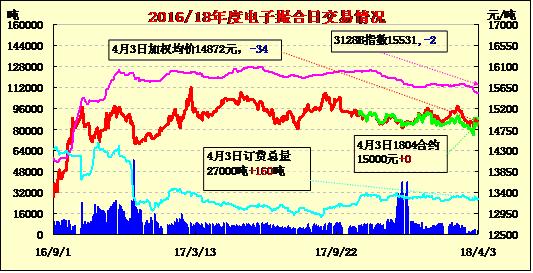 3日電子撮合交易成交量較前一交易日略有增加,合同均價多數(shù)收跌。其中MA18067成交量較大,為860噸;活躍交投的合同多集中于中期合同,MA1807訂貨量最大,累計訂貨量為7450噸。截至3月22日美棉僅裝運了176萬噸,與上年度基本持平,尚有140萬噸沒有裝運,美棉期末庫存將高達(dá)131萬噸,而中國繼續(xù)敞開不限量拋儲,南半球新棉即將上市,整體市場供應(yīng)寬松,這將繼續(xù)壓制棉價,未來ICE期棉可能繼續(xù)回調(diào),5月合約有望挑戰(zhàn)76美分/磅一線支撐位。