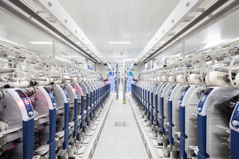 進(jìn)入車間,排列整齊的各色設(shè)備運(yùn)轉(zhuǎn)有序,卻少有人走動(dòng),取而代之的是隨處可見的“機(jī)器人”,它們正成為車間里的主角。如最直觀的包裝環(huán)節(jié)。作為紡紗工業(yè)主要環(huán)節(jié)之一,包裝原本是“苦活、累活”的代名詞。但這個(gè)車間建立起長度為35公里的軌道,粗紗從一樓到二樓自動(dòng)入庫,整個(gè)流程無任何人工直接參與。