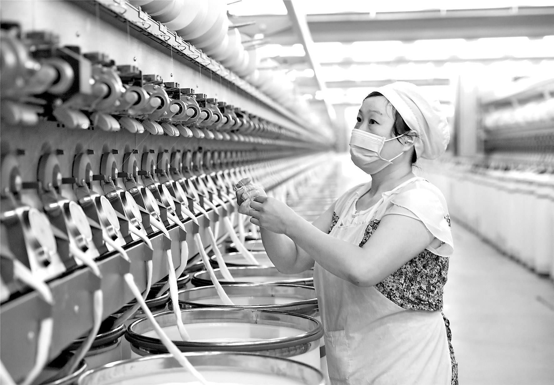 9月1日,烏蘇市昌茂紡織有限責(zé)任公司職工在氣流紡車間工作。目前,烏蘇市紡織、化纖企業(yè)有20家,今年1-8月該市棉紡織企業(yè)產(chǎn)量達82.2萬錠,同比增長36.2%,吸納3700余人就業(yè)。(標(biāo)題:烏蘇市紡織企業(yè)產(chǎn)量穩(wěn)增)