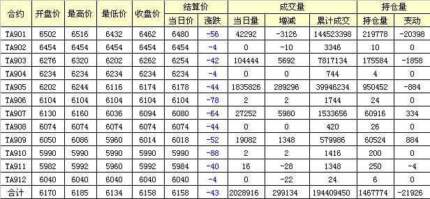 主力TA901合約當日交易走勢
