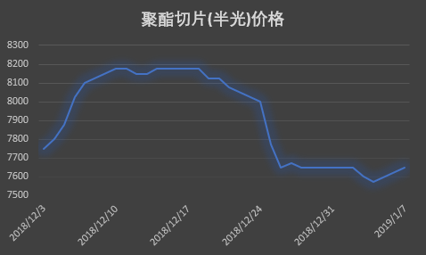 3、本周(1月7-13日)中石化聚酯切片指導(dǎo)價:普通半光8000元/噸;細(xì)旦專用(FC510)8150元/噸;超有光型(SB500)8100元/噸、膜級基料(FG600)8100元/噸、工業(yè)絲型高模低縮型(IG703)8130元/噸;無紡專用8100元/噸