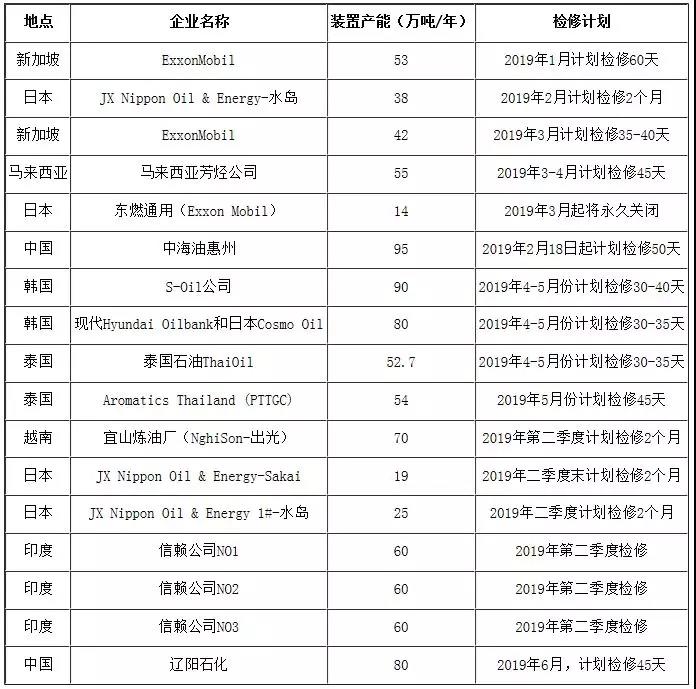 上半年亞洲地區(qū)PX裝置檢修計(jì)劃