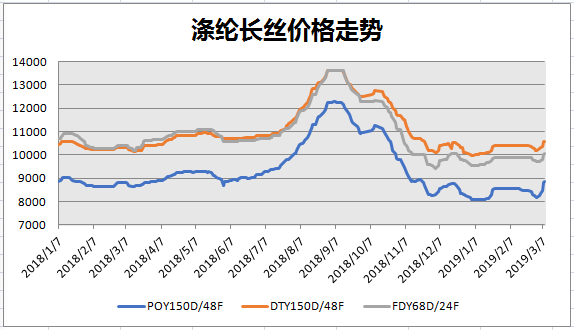 陽春三月,滌綸長(zhǎng)絲行情止跌反彈。截至3月7日,常規(guī)POY150D/48F主流價(jià)位8500-9000元/噸,較2月末上漲4.8%,比年內(nèi)低點(diǎn)上漲8.0%。制造業(yè)增值稅下調(diào),商品市場(chǎng)整體表現(xiàn)強(qiáng)勢(shì)。再加上,PTA檢修動(dòng)態(tài)增多,推動(dòng)期貨及現(xiàn)貨價(jià)格強(qiáng)勁上漲。與此同時(shí),MEG行情同步跟漲。上游原料大幅上漲,有效刺激加彈和織造工廠采購積極性,聚酯工廠產(chǎn)銷數(shù)據(jù)普遍放量,滌綸長(zhǎng)絲價(jià)格連續(xù)上漲,單日漲幅擴(kuò)大至200-300元/噸。