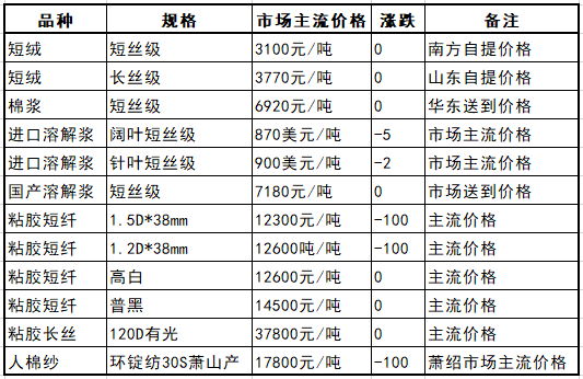 棉漿價(jià)格穩(wěn)中偏弱,華東主流漿廠報(bào)價(jià)延續(xù)7150元/噸,近期粘膠短纖價(jià)格大幅跳水,部分意向價(jià)格商談多6900元/噸或以內(nèi)。