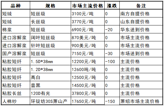 棉漿價格穩(wěn)中偏弱,華東主流漿廠報價延續(xù)7150元/噸,近期粘膠短纖價格大幅跳水,部分意向價格商談多6900元/噸或以內(nèi)。