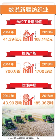 自2014年新疆實施發(fā)展紡織服裝產業(yè)帶動百萬人就業(yè)規(guī)劃以來,新疆紡織服裝產業(yè)累計完成固定資產投資1700多億元,紡織工業(yè)增加值從41.39億元增長到108.14億元;棉紡產能從700萬錠增長到1700萬錠,紗線產量從43.99萬噸增長到185.36萬噸。新增紡織服裝企業(yè)2200余家,新增就業(yè)人數約45萬人。