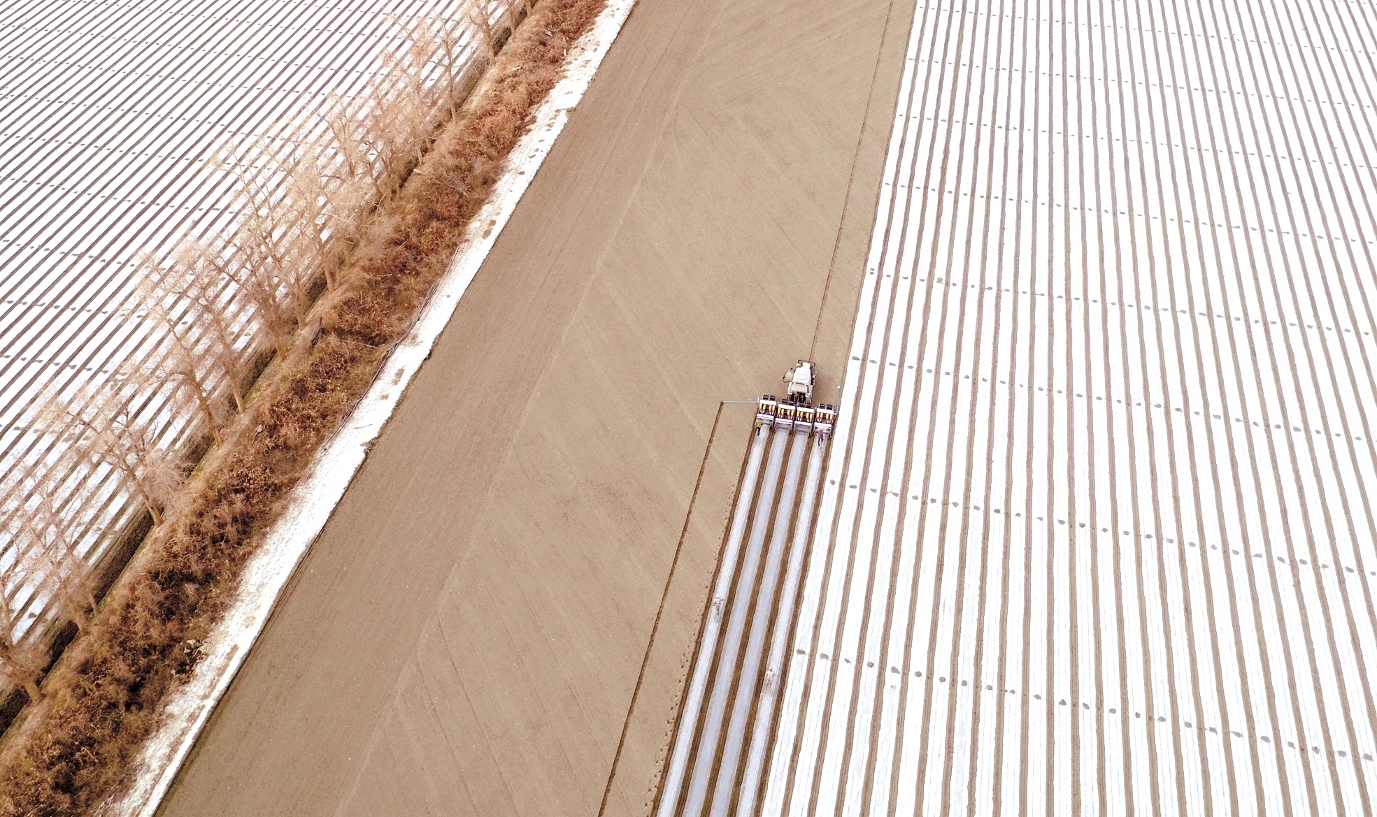 3月31日第二師鐵門(mén)關(guān)市雙豐鎮(zhèn)播種棉花(無(wú)人機(jī)拍攝)。