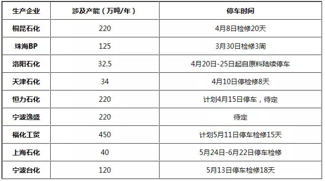 2季度PTA裝置檢修計劃