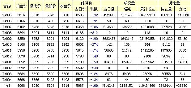 主力TA905合約當日交易走勢