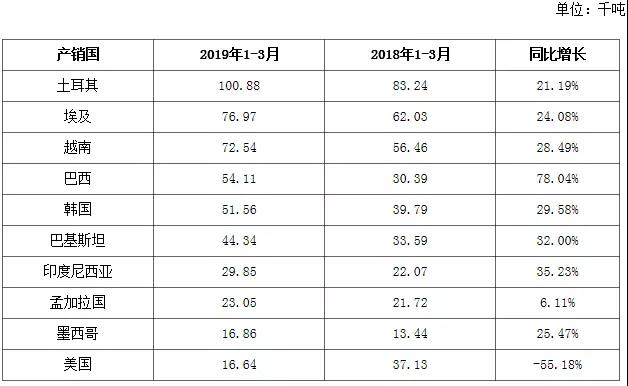 2019年1-3月中國滌綸長絲出口前十大貿易伙伴依次是土耳其、埃及、越南、巴西、韓國、巴基斯坦、印度尼西亞、孟加拉過、墨西哥、美國,出口滌綸長絲486.79千噸,占出口總量的70.39%,累計占比同比提升0.62個百分點。其中對巴西、巴西、越南三個國家出口增加最為明顯,分別出口54.11千噸、29.85千噸、44.34千噸,同比下降78.04%、35.23%、32.00%。