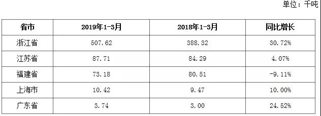 中國滌綸長絲出口收發(fā)貨地主要集中于浙江省、江蘇省、福建省。2019年1-3月浙江省、江蘇省、福建省出口滌綸長絲682.67千噸,占出口總量的98.71%,同比提升0.01個百分點。具體到各省份來看,浙江省出口滌綸長絲507.62千噸,同比增長30.72%;江蘇省出口滌綸長絲87.71千噸,同比增長4.07%;福建省出口滌綸長絲73.18千噸,同比下降9.11%。