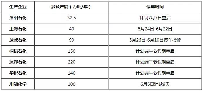 表1 6月PTA裝置檢修計劃表