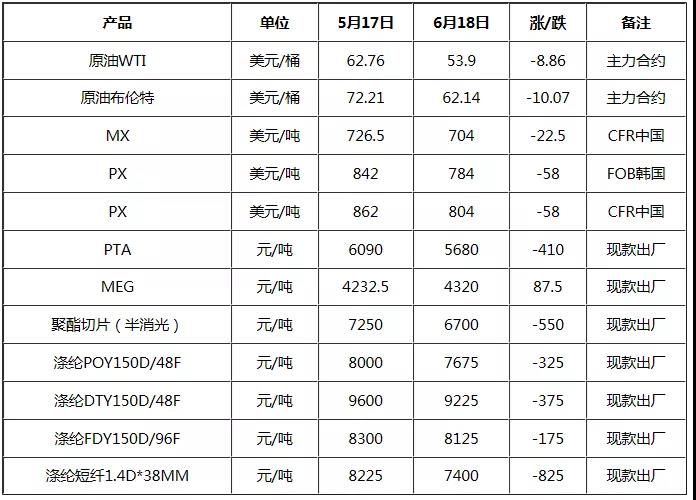 在短短1個月時間內(nèi),因全球經(jīng)濟(jì)放緩預(yù)期,引發(fā)需求下滑擔(dān)憂加劇,加以美國原油庫存及產(chǎn)量雙增,及歐佩克產(chǎn)油國減產(chǎn)事宜不確定性,國際油價呈現(xiàn)偏弱盤整走勢,進(jìn)而成本端支撐放緩;PX方面,除成本動能不足以外,供需格局壓力亦尤為明顯,伴隨著恒力石化450萬噸/年P(guān)X生產(chǎn)線路全線投放,每月國內(nèi)新增PX釋放量達(dá)30萬噸左右,且進(jìn)入6月以來國內(nèi)PTA裝置意外停車檢修事件增多,亦相應(yīng)降低對PX需求能力,故PX利空氛圍占據(jù)主導(dǎo),走勢易跌難漲;PTA及聚酯產(chǎn)品方面,則因庫存累積且產(chǎn)銷表現(xiàn)低迷影響而伴隨性下行,但整體價格波動更為劇烈;MEG則是因剛需補(bǔ)貨、外商合約減量等因素影響而堅(jiān)挺運(yùn)行。