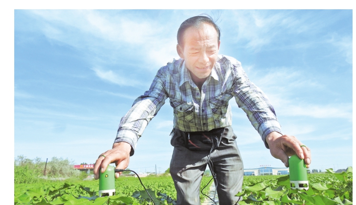 6月18日,兵團第七師130團科農(nóng)機械制造有限責任公司技術(shù)人員李濤在棉田演示操作新型棉花打頂機。今年公司引進的新型棉花打頂機易操作、效率高,每人每天可打棉頂15畝,是人工打頂效率的5倍,達到省時、省工、省費用、方便快捷的目的。