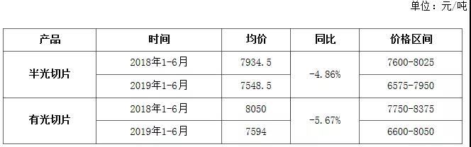 受聚酯行業(yè)整體行情下跌的利空,今年切片運(yùn)行整體較去年無(wú)明顯好轉(zhuǎn),甚至還出現(xiàn)下跌。據(jù)統(tǒng)計(jì)數(shù)據(jù)顯示,2019年1-6月江浙地區(qū)半光切片和有光切片均價(jià)分別7948.5元/噸和7594元/噸,較去年同期明顯下跌,漲幅分別4.86%和5.67%。整體價(jià)格區(qū)間也較曲面明顯下降,年內(nèi)切片最低價(jià)低于去年同期1000元/噸以上。