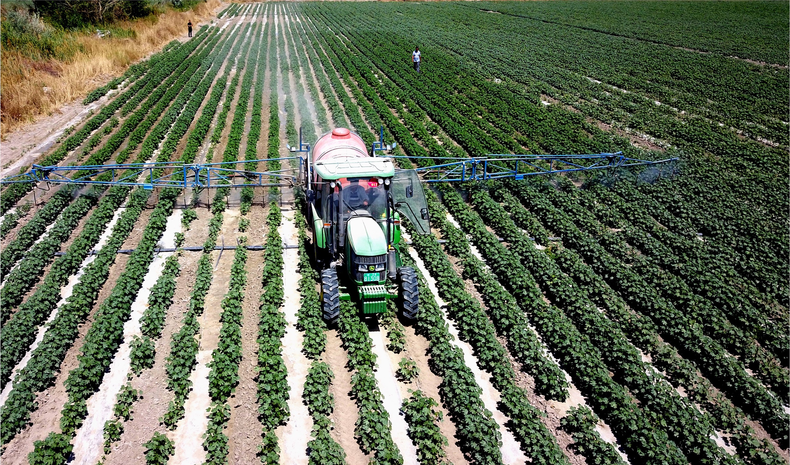 近年來,巴州農(nóng)機(jī)裝備總量持續(xù)增長(zhǎng),農(nóng)機(jī)作業(yè)質(zhì)量和農(nóng)機(jī)服務(wù)能力顯著提升,巴州主要農(nóng)作物綜合機(jī)械化水平不斷提高。圖為7月2日,在尉犁縣一塊棉田里,一臺(tái)拖拉機(jī)正在進(jìn)行葉面施肥作業(yè)。