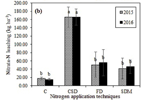 氮是植物生長(zhǎng)重要的必需養(yǎng)分,但其在砂土中淋失率高,尤其是作物吸收較好的硝態(tài)氮(NO3-N),相對(duì)而言,淤泥或粘土中的硝化過程較排水和通氣良好的土壤快得多。因此在沙質(zhì)土壤中,NO3-N的淋溶速度更快,幾天內(nèi)從根部土壤排出,幾個(gè)月后滲濾進(jìn)入含水層,對(duì)地下水水質(zhì)造成嚴(yán)重危害。此外傳統(tǒng)的洪水灌溉和施氮方式進(jìn)一步加劇氮素淋失,導(dǎo)致氮吸收率降低,限制作物的生長(zhǎng)和生產(chǎn)力。因此改進(jìn)施肥方式不僅對(duì)作物的健康生長(zhǎng)有益,而且對(duì)環(huán)境保護(hù)具有重要意義。