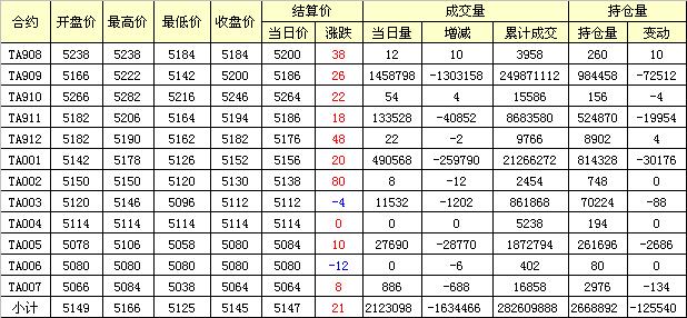 主力TA909合約當日交易走勢