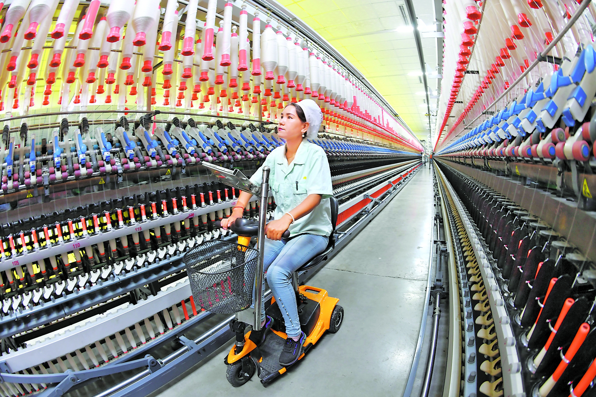 8月16日,工人在疏勒縣南疆齊魯工業(yè)園區(qū)疏勒如意科技紡織有限公司車間查看設(shè)備運行情況。2015年,援疆企業(yè)——山東如意集團(tuán)在疏勒縣成立如意科技紡織有限公司。該企業(yè)1期建成后吸納400多名農(nóng)村富余勞動力就業(yè),其中28%是貧困戶。