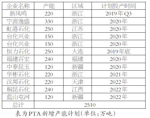 PTA接下來(lái)將進(jìn)入較為明顯的擴(kuò)產(chǎn)周期,年內(nèi)新鳳鳴220萬(wàn)噸PTA裝置預(yù)計(jì)在2019年10月份投產(chǎn),恒力石化250萬(wàn)噸PTA裝置預(yù)計(jì)在2019年年底投產(chǎn)。而2020-2022年,PTA將有接近2000萬(wàn)噸新裝置投產(chǎn)。