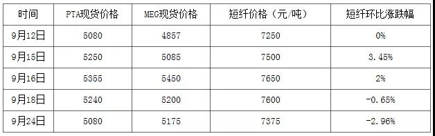 由表1可以看出,沙特事件間接引起滌綸短纖價(jià)格上漲400元/噸。然而消息面過后,原料下滑,需求前期補(bǔ)貨基本上呈現(xiàn)出謹(jǐn)慎觀望狀態(tài),滌綸短纖價(jià)格也開始進(jìn)入回吐。截止9月24日滌綸短纖主要原料PTA現(xiàn)貨價(jià)格與中秋節(jié)節(jié)前價(jià)格一致,下滑速度快于滌綸短纖;乙二醇與節(jié)前差距大于300元/噸,這也證明乙二醇在去庫存期間,或許沙特事件多少仍在輕微影響乙二醇供應(yīng)面。然而滌綸短纖價(jià)格7375元/噸,與節(jié)前價(jià)差125元/噸,仍存在下滑預(yù)期。