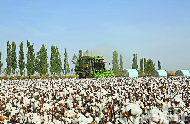10月21日,沙雅縣古勒巴格鎮(zhèn)古如其闊坦村,大型采棉機(jī)正在棉田里作業(yè)。連日來,沙雅縣185萬畝優(yōu)質(zhì)棉陸續(xù)進(jìn)入采摘期,一片豐收景象。