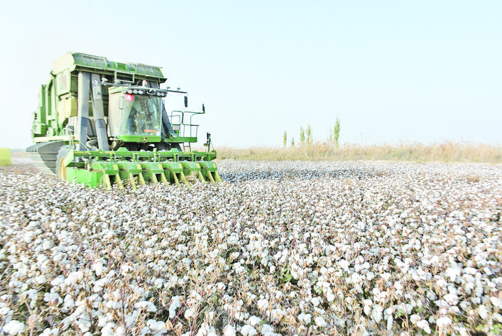 10月24日,阿瓦提縣烏魯卻勒鎮(zhèn)拉依當(dāng)村用大型采棉機(jī)采摘棉花。據(jù)悉,與往年人工采摘相比,機(jī)采大幅加快棉花采摘進(jìn)度。
