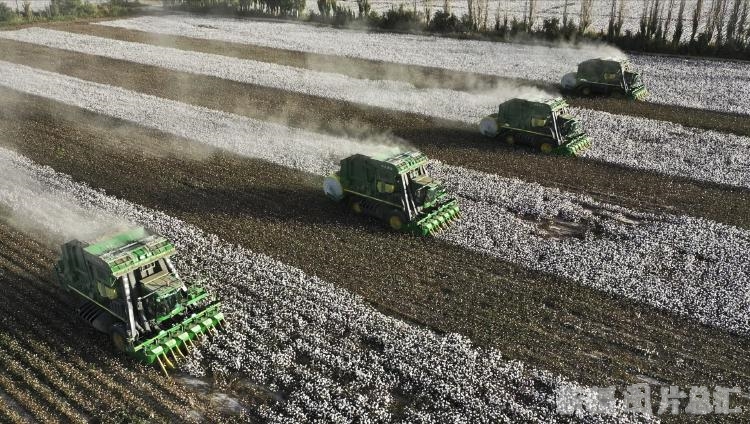 11月2日,采棉機在尉犁縣興平鄉(xiāng)統(tǒng)其克村棉田采收棉花。今年該縣102.87萬畝棉花獲得豐收,其中機采棉99.47萬畝,目前棉花采收工作已進(jìn)入尾聲。