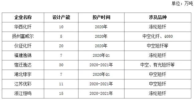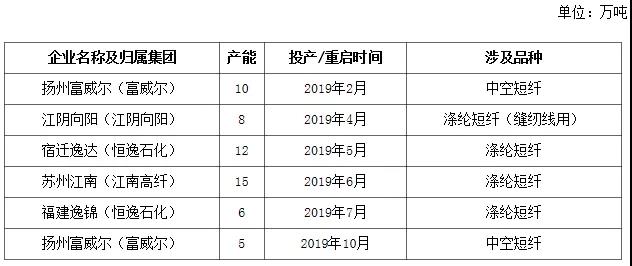 表1 2019年直紡滌綸短纖裝置新增產(chǎn)能及復(fù)產(chǎn)產(chǎn)能統(tǒng)計表