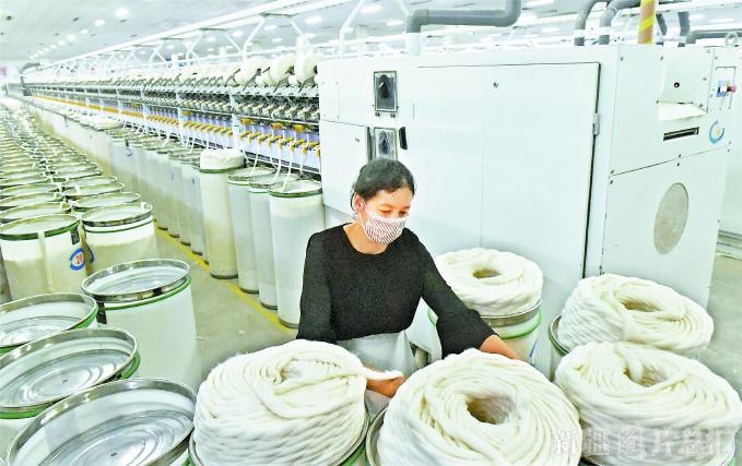 11月9日,貧困農(nóng)民阿曼古麗·牙生在巴楚縣香棉爾紡織有限公司車間工作。該公司主要從事紡紗、織布和服裝生產(chǎn)銷售,已吸納當(dāng)?shù)剞r(nóng)村富余勞動力轉(zhuǎn)移就業(yè)343人,其中貧困農(nóng)民71人。