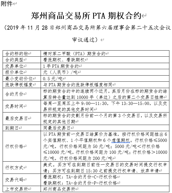 《鄭州商品交易所PTA期權合約》已鄭州商品交易所第六屆理事會第二十五次會議審議通過,并已報中國證監(jiān)會備案,現(xiàn)予發(fā)布,自PTA期權合約掛牌之日起施行。