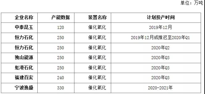 2019-2020年P(guān)TA新增產(chǎn)能投放計(jì)劃表
