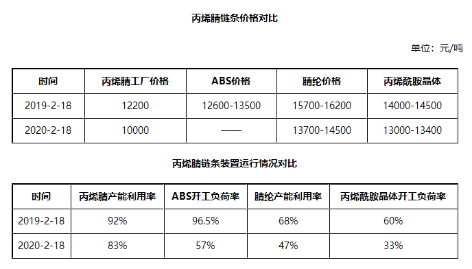 從行業(yè)整體運行看,雖丙烯腈行業(yè)變動不大,但主流下游工廠裝置負荷運行低位,也與往年表現(xiàn)明顯不同,且目前終端工廠復工緩慢,鏈條各產(chǎn)品均有不同程度庫存累積,整體看空氣氛明顯,廠商操盤信心不足。