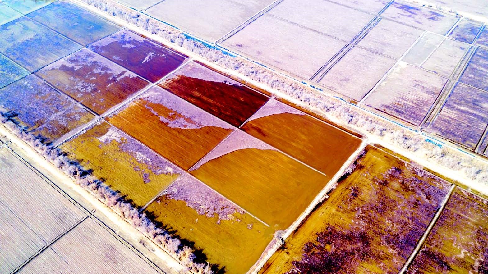 3月11日,航拍的尉犁縣阿克蘇普鄉(xiāng),春水灌溉使廣袤的棉田煥發(fā)生機(jī)。