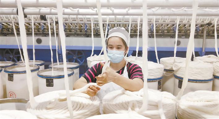 3月22日,位于鐵門關(guān)經(jīng)濟(jì)技術(shù)開發(fā)區(qū)的新恒立紡織有限公司生產(chǎn)車間內(nèi),來自喀什地區(qū)的女工米里克扎提·阿木提在操作。該公司開足馬力生產(chǎn),狠抓產(chǎn)量、質(zhì)量、安全、營銷,月生產(chǎn)優(yōu)質(zhì)棉紗1000余噸,產(chǎn)銷率100%,預(yù)計(jì)1季度產(chǎn)值可完成6000余萬元。