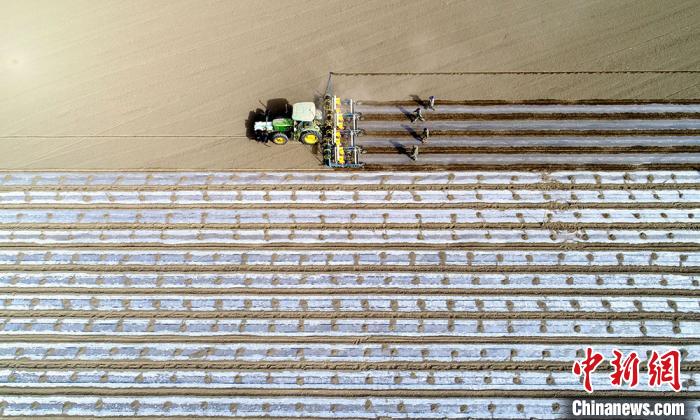 新疆生產(chǎn)建設(shè)兵團第二師二十九團一臺裝有GPS衛(wèi)星定位導(dǎo)航系統(tǒng)的大型播種機開足馬力播種棉花。4月2日,新疆兵團第二師出動1000多臺(套)農(nóng)機具開始播種棉花,田間地頭呈現(xiàn)出一派繁忙景象,構(gòu)成一幅美麗的勞動畫卷。隨著氣溫回升,為確保今年棉花增產(chǎn)豐收,位于新疆塔里木墾區(qū)的新疆兵團職工群眾搶抓農(nóng)時及土壤墑情好的有利時機,出動人力機力,按照“節(jié)水、精棉、優(yōu)質(zhì)、高產(chǎn)”的要求,全面應(yīng)用農(nóng)業(yè)高新植棉技術(shù),由南向北展開棉花播種工作,預(yù)計4月上旬將全部完成播種任務(wù)。