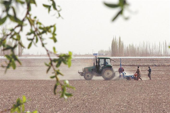 4月8日,大型播種機在十三師黃田農(nóng)場一連的一塊棉田里播種棉花。連日來,黃田農(nóng)場職工搶抓氣溫回升、土壤墑情好的有利時機抓緊播種棉花,田間地頭一派繁忙景象。